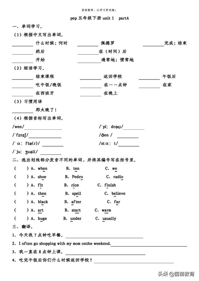 一课一练 五年级下册英语unit1 Parta 附答案 小初高题库试卷课件教案网